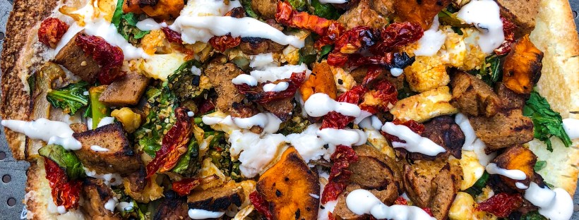 Greek/Mediterranean Pizza with homemade gyro seitan meat (V)